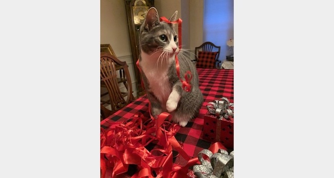 | LAST BUT CERTAINLY NOT LEAST... Pets of the day! Reader Frederick Morsheimer emails: "Maeby celebrates her birthday. She is very playful with ribbons, bows and boxes. Maeby is a rescue kitty from the streets of Philadelphia..." | |
