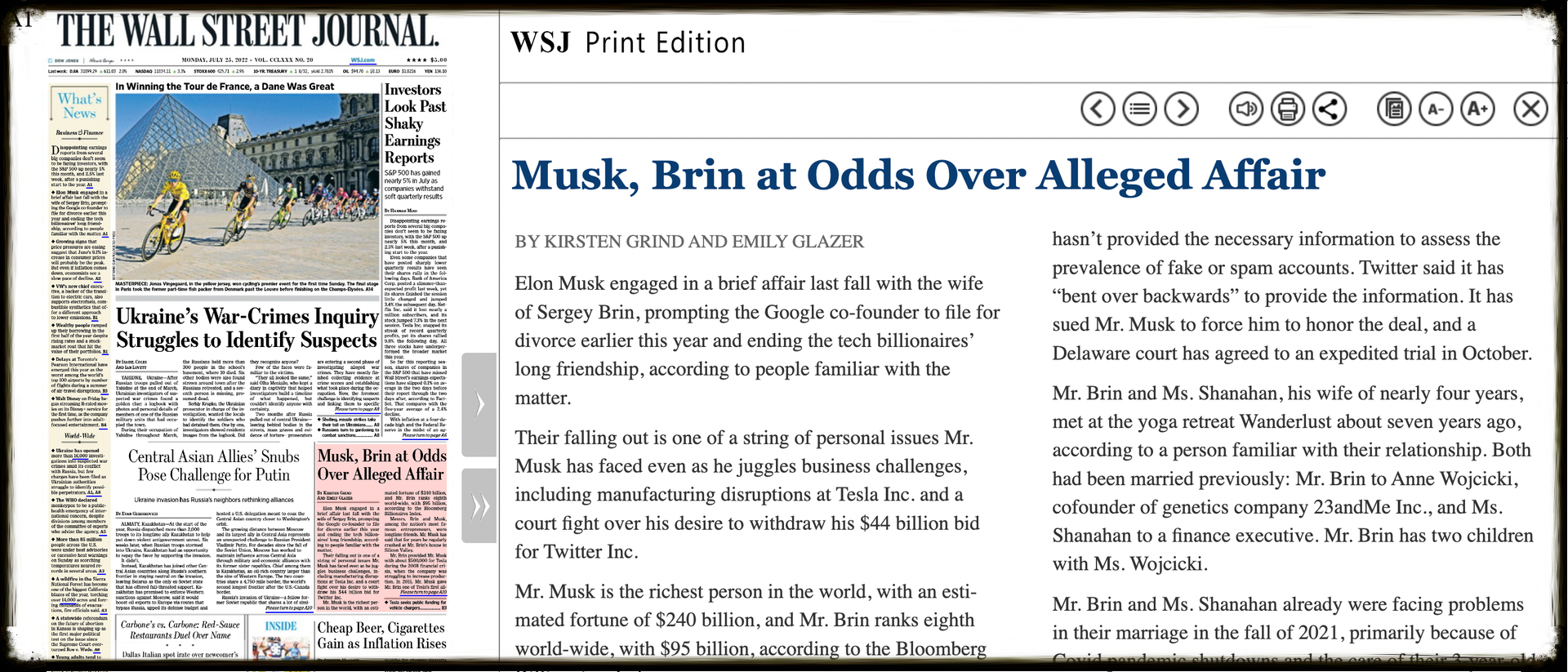 | >> Puck's Dylan Byers writes about WSJ's scoop about the alleged affair between Elon Musk and Sergey Brin's wife Nicole Shanahan: It "set off a series of cascading questions about the article of journalism, itself: What counts as an affair? What is an 'alleged affair'? And then: How could the reporters possibly know? And last but not least: Why did the Journal, the classy establishment business bible, publish this very personal piece in the first place?" >> CNN's Joan Biskupic details how the leak of the Roe v. Wade draft opinion made Chief Justice John Roberts' attempt to convince his conservative colleagues not to overturn the decision "all but impossible..." >> Don't miss this profile on Ron DeSantis spokesperson Christina Pushaw by WaPo's Paul Farhi... >> Alice Markham-Cantor writes for Curbed about how it has become "a lot harder than you'd expect" to purchase a copy of The New York Times in New York City... >> WaPo's Elahe Izadi outlines "how local journalists proved a 10-year-old's abortion wasn't a hoax..." >> The New Yorker's Kyle Chayka writes about about "the age of algorithmic anxiety:" Interacting online today "means being besieged by system-generated recommendations. Do we want what the machines tell us we want?" >> Bloomberg's Norah Mulinda and Amina Niasse detail how Gen Z is using TikTok like Google, "upsetting the old internet order..." | |