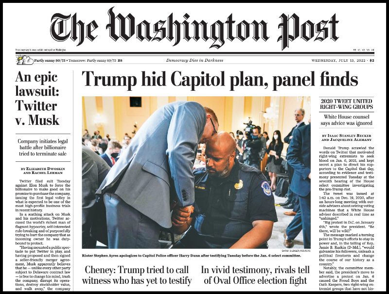 | The seventh 1/6 hearing Former Oath Keepers spokesman Jason Van Tatenhove may have said it best at Tuesday's hearing: "I think we need to quit mincing words and just talk about truths." The truth of the Jan. 6 attack, he said, is that "what it was going to be was an armed revolution... This could have been the spark that started the new civil war, and no one would have won there." >> "Perhaps the most unexpected moment of the hearing" was at the very end, when Rep. Liz Cheney raised the possibility of a witness tampering investigation for a second time... >> John Dickerson speaking on CBS about the effects of Trump's lies: "There are still people hearing these messages and that means this threat is ongoing and alive in this very moment..." >> On CNN, Jake Tapper connected the dots between the DC hearing and the Uvalde hallway video, saying, "For our democracy to survive, we need transparency from our public officials. If we do not get it, we get lied to..." | |