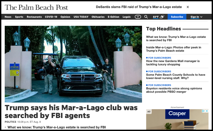 Some of the initial news alerts about the FBI action were untrue because, true to form, some parts of Trump's statement were untrue. He said his home was "currently under siege, raided, and occupied by a large group of FBI agents," but all the reliable reporting indicated that the FBI action had concluded by the time he spoke out. Trump's statement also contained "a fun instance of Trump getting high on his own disinfo supply," NBC's Ben Collins pointed out. "He mentions Hillary Clinton 'acid washing 33,000 E-mails.' In reality, an IT guy used an app called BleachBit. In Trumpworld, she poured literal acid on the emails." This Florida reporter was the first to know Via Slate: "The news of the raid was first reported by Peter Schorsch, the publisher of Florida Politics, a news organization that closely covers congressional and down ballot races in the state." He tweeted about it at 6:36pm, citing two sources. I immediately texted it to Oliver Darcy and said "wonder if this is real." Darcy said he figured "Trump will rant about it online" – and he was right. Trump's statement followed within minutes. >> More: "In a phone call with Slate, Schorsch said that he had heard about the FBI raid of Mar-a-Lago from a 'longtime source in Republican politics who has a law enforcement background' and knew a lot about 'south Florida law enforcement...'" Earlier in the day... The day began with reminders that the Trump era is far from over. Susan Glasser and Peter Baker came out with the excerpt from their September book "The Divider" that we previewed in Sunday night's newsletter. And Maggie Haberman, ahead of her October launch of "Confidence Man," shared photos of documents that Trump was said to have flushed down toilets. Both books surged on Amazon's new releases list on Monday thanks to preorders... | |