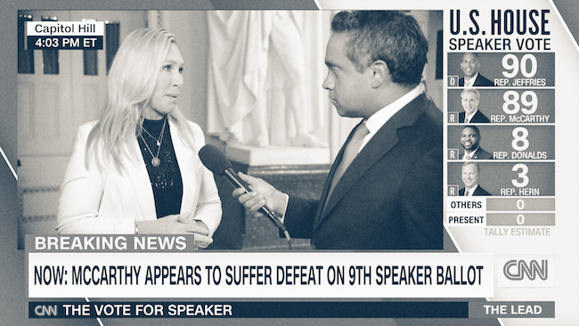 - Making the same point we made last night, Jeremy Peters writes about how McCarthy's unprecedented leadership battle is being "mirrored in conservative media." (NYT)