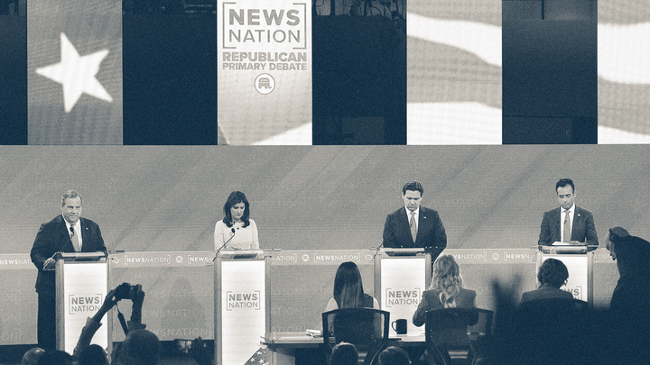 | CNN Photo Illustration/Brian Snyder/Reuters | NewsNation in the Spotlight: NewsNation is finding some spotlight, hosting the fourth Republican presidential primary debate Wednesday evening. The GOP melee, the final of 2023, was significantly slimmed down, featuring only four candidates, Ron DeSantis, Nikki Haley, Vivek Ramaswamy, and Chris Christie. Moderated by Elizabeth Vargas, Megyn Kelly, and Eliana Johnson, it is likely to also see slimmed down ratings as well. Viewer interest in the Republican face-offs has dwindled since Fox News hosted the first debate earlier this year. (I'm curious whether this debate will surpass the DeSantis-Gavin Newsom showdown that took place on Fox News last week.) That said, for NewsNation, a self-described "unbiased" channel that most of the country is likely not familiar with, it's a big moment. On that point, it's notable that the Republican National Committee opted to host a GOP debate on NewsNation, given it has far less reach than networks such as ABC and CBS. One can only guess why. 🤔 | |