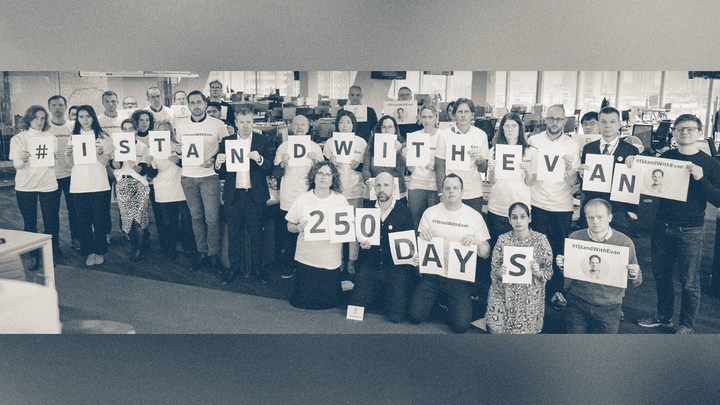 | CNN Photo Illustration/Wall Street Journal | 250 Days Behind Bars: The WSJ on Monday marked a grim milestone: 250 days of Evan Gershkovich's detention in Russia. Editor-In-Chief Emma Tucker called it "an appalling milestone," writing in a letter to readers that it has been "250 days since the concept of a free press — the underpinning of a free society — has been singularly challenged by the arrest of the first American reporter in Russia on an espionage charge since the Cold War." And Dow Jones chief Alma Latour said that "it cannot be overstated that his incarceration is a deeply disturbing development for anyone who values free press or freedom." To mark the solemn occasion, The WSJ ran a full-page ad in its print edition. And the outlet's bureaus took group photos and circulated them.